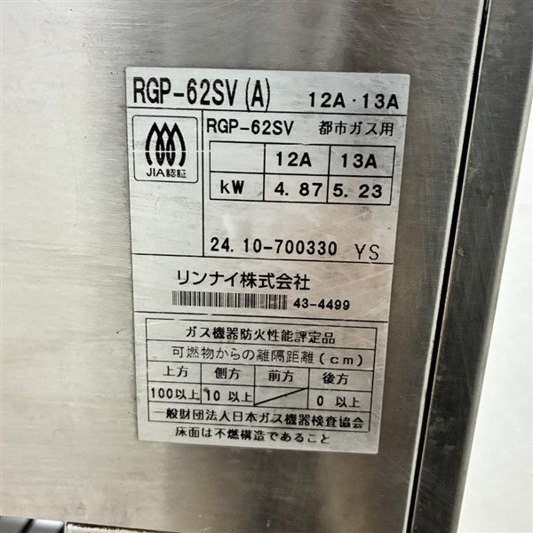 他の画像を見る 2024年製 リンナイ ガス上火式グリラー RGP-62SV(A) 大阪店 中古品 都市ガス 定価 ¥ 80,630 のところ 販売価格 ¥ 45,100 税込 W630xD310xH395商品ランク:B カートに入れる お気に入りに登録する
