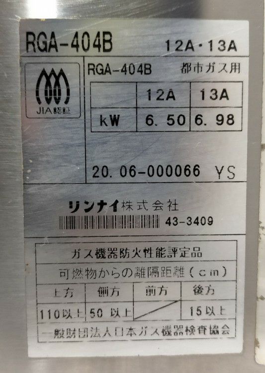 2020年製 リンナイ ガス下火式グリラー RGA-404B