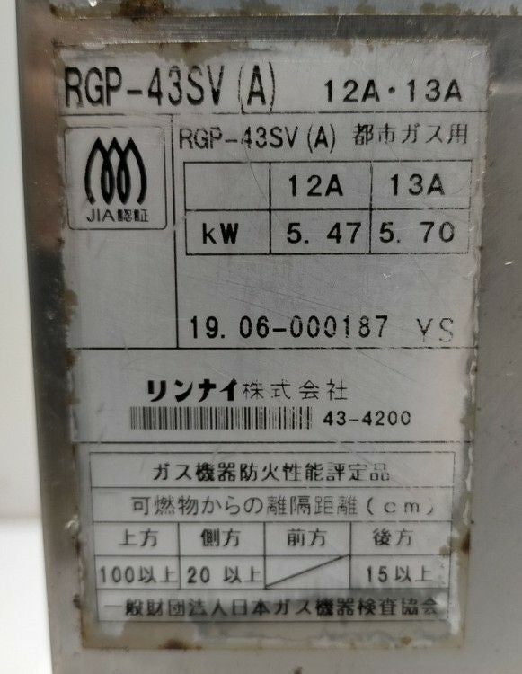 他の画像を見る 2019年製 リンナイ ガス上火式グリラー RGP-43SV(A) 東京町田店 中古品 都市ガス 定価 ¥ 136,290 のところ 販売価格 ¥ 49,500 税込 SOLD OUT W613xD425xH602商品ランク:B 詳細を見る お気に入りに登録する