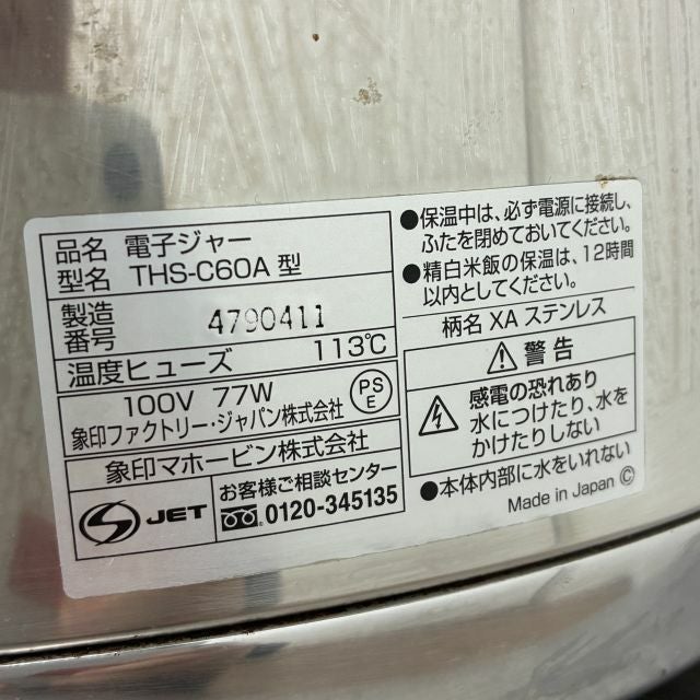 他の画像を見る 2015年製 象印 電子保温ジャー THS-C60A 大阪店 中古品 単相100V 定価 ¥ 36,300 のところ 販売価格 ¥ 8,800 税込 SOLD OUT W460xD380xH320商品ランク:B 詳細を見る お気に入りに登録する
