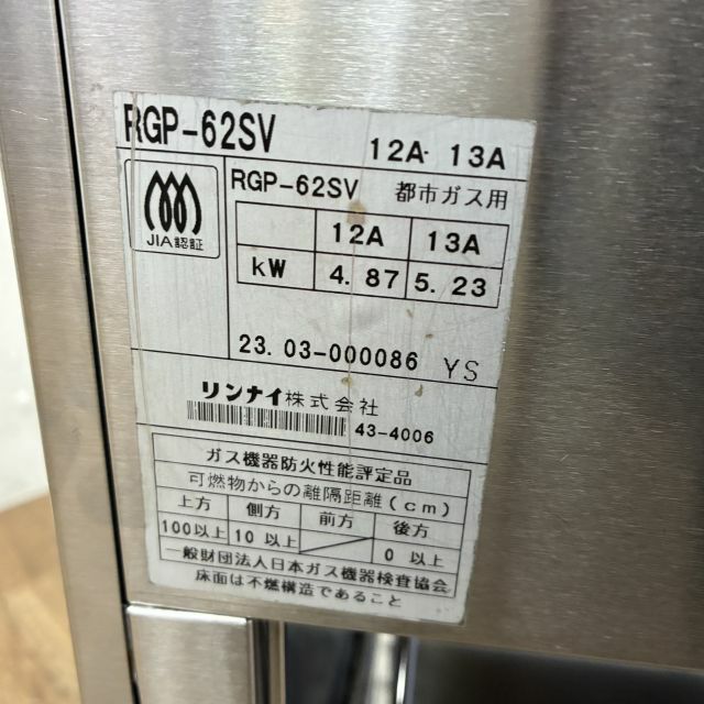 他の画像を見る 2023年製 リンナイ ガス上火式グリラー RGP-62SV 大阪店 中古品 都市ガス 定価 ¥ 80,630 のところ 販売価格 ¥ 44,000 税込 W630xD310xH395商品ランク:B カートに入れる お気に入りに登録する