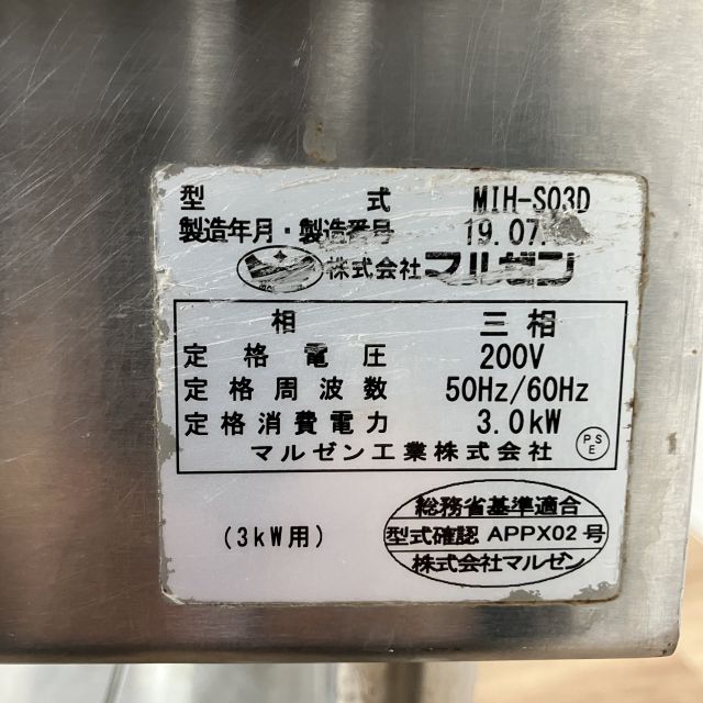 他の画像を見る 2019年製 マルゼン 1口IHコンロ MIH-S03D 大阪店 中古品 三相200V 定価 ¥ 389,400 のところ 販売価格 ¥ 121,000 税込 SOLD OUT W450xD600xH800+100商品ランク:B 詳細を見る お気に入りに登録する
