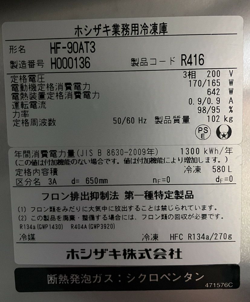 他の画像を見る 2018年製 ホシザキ 縦型冷凍庫 HF-90AT3 東京町田店 中古品 三相200V 販売価格 ¥ 192,500 税込 W900xD650xH1910商品ランク:B カートに入れる お気に入りに登録する