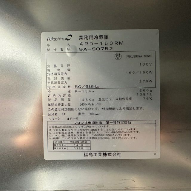 他の画像を見る 2019年製 フクシマガリレイ 縦型冷蔵庫 ARD-150RM 東京足立店 中古品 単相100V 定価 ¥ 1,338,700 のところ 販売価格 ¥ 132,000 税込 W1490xD800xH1950商品ランク:B カートに入れる お気に入りに登録する
