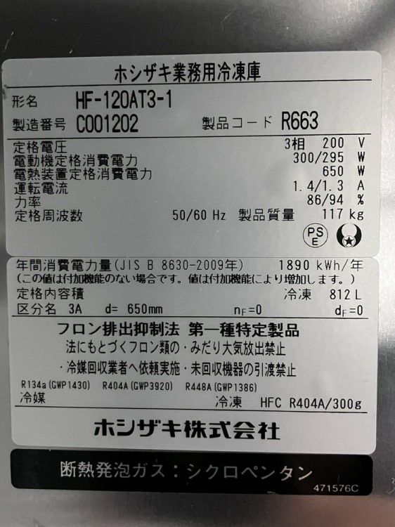 2023年製 ホシザキ 縦型冷凍庫 HF-120AT3-1