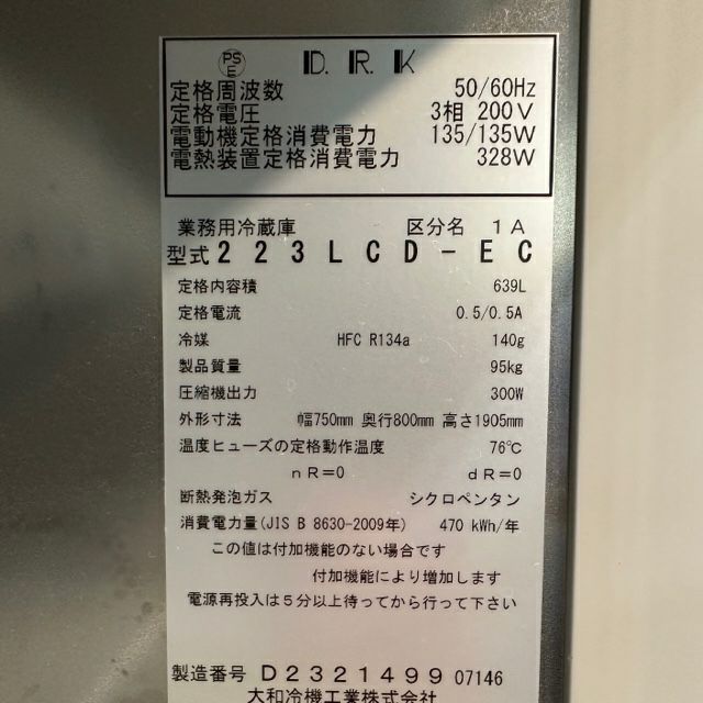 他の画像を見る 2016年製 大和冷機 縦型冷蔵庫 223LCD-EC 東京足立店 中古品 三相200V 販売価格 ¥ 82,500 税込 W750xD800xH1905商品ランク:B カートに入れる お気に入りに登録する