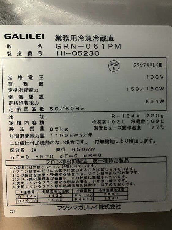 他の画像を見る 2021年製 フクシマガリレイ 縦型冷凍冷蔵庫 GRN-061PM 東京町田店 中古品 単相100V 販売価格 ¥ 143,000 税込 SOLD OUT W610xD650xH1950商品ランク:B 詳細を見る お気に入りに登録する