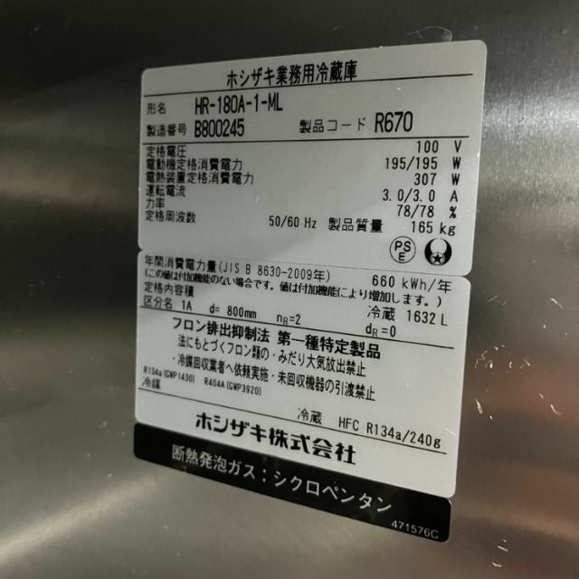 他の画像を見る 2022年製 ホシザキ 縦型冷蔵庫 HR-180A-1-ML 大阪店 中古品 単相100V 定価 ¥ 1,745,700 のところ 販売価格 ¥ 177,100 税込 SOLD OUT W1800xD800xH1910商品ランク:B 詳細を見る お気に入りに登録する