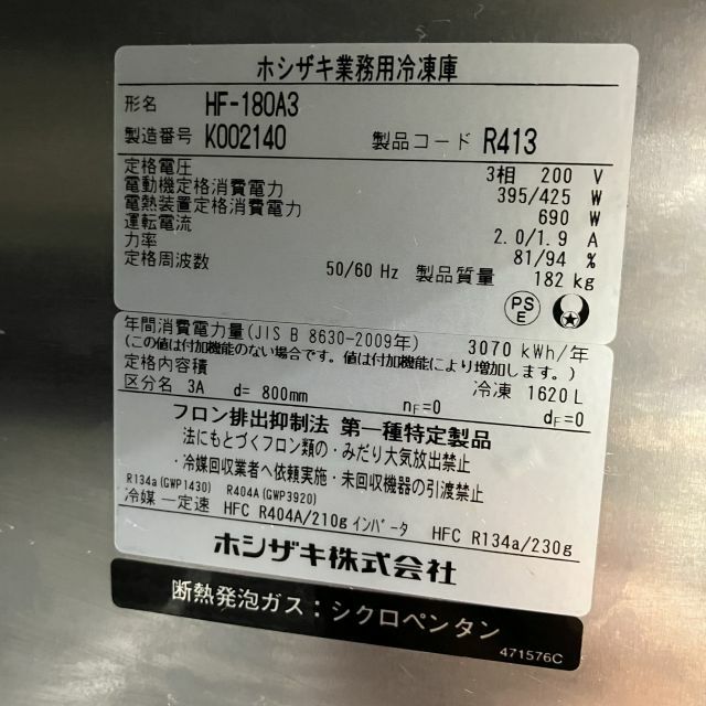 他の画像を見る 2020年製 ホシザキ 縦型冷凍庫 HF-180A3 大阪店 中古品 三相200V 定価 ¥ 1,894,200 のところ 販売価格 ¥ 215,600 税込 SOLD OUT W1800xD800xH1910商品ランク:B 詳細を見る お気に入りに登録する