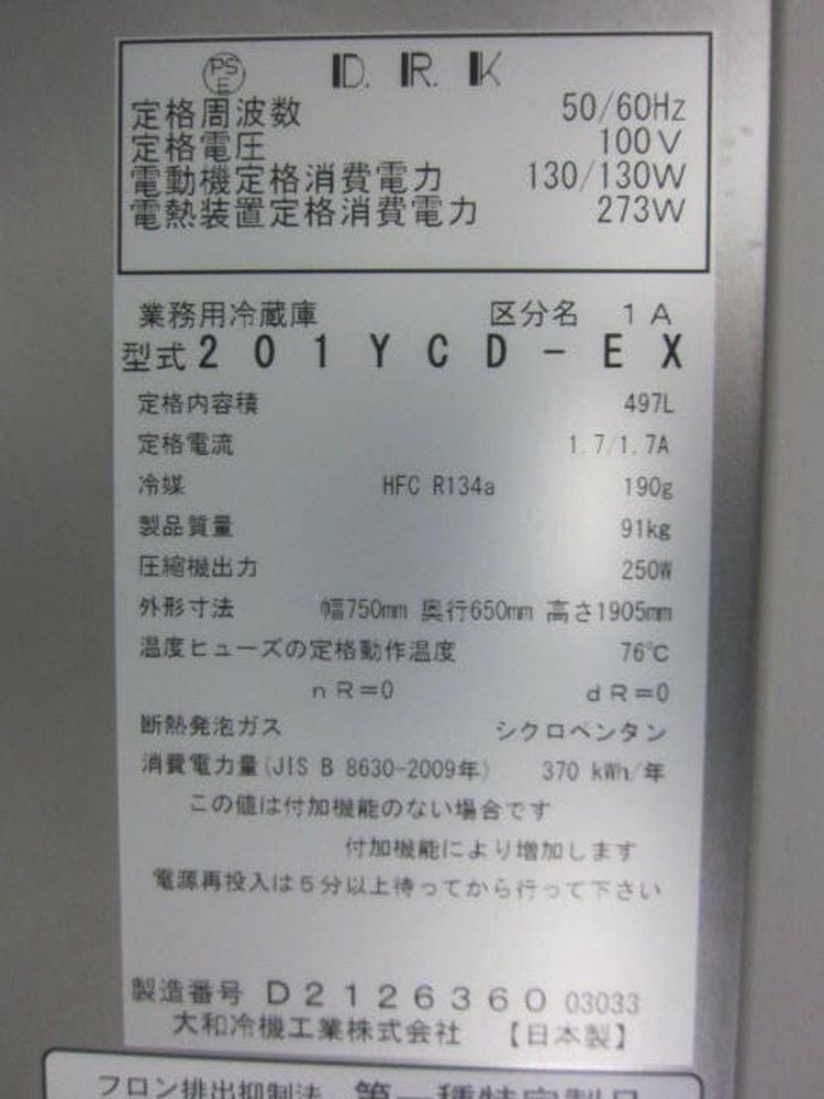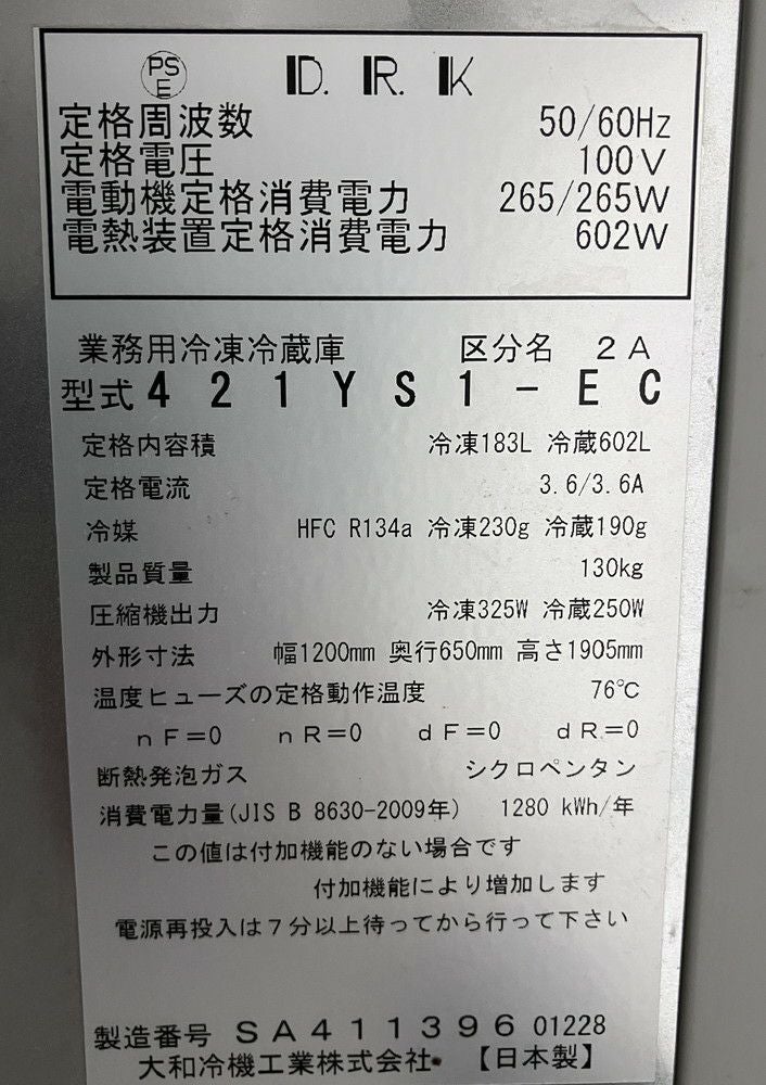 他の画像を見る 2018年製 大和冷機 縦型冷凍冷蔵庫 421YS1-EC 東京町田店 中古品 単相100V 販売価格 ¥ 129,800 税込 SOLD OUT W1200xD650xH1905商品ランク:B 詳細を見る お気に入りに登録する