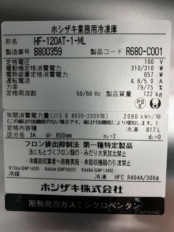 他の画像を見る 2022年製 ホシザキ 縦型冷凍庫 HF-120AT-1-ML 東京町田店 中古品 単相100V 販売価格 ¥ 242,000 税込 W1200xD650xH1910商品ランク:B カートに入れる お気に入りに登録する