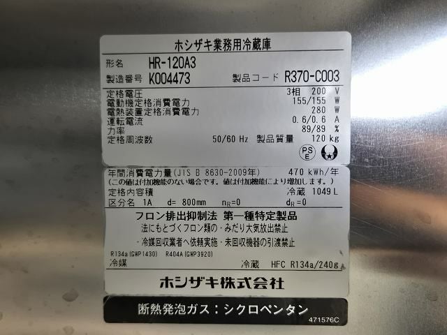 他の画像を見る 2020年製 ホシザキ 縦型冷蔵庫 HR-120A3 ※備考欄必読 愛知店 中古品 三相200V 定価 ¥ 1,263,900 のところ 販売価格 ¥ 159,500 税込 W1200xD800xH1910商品ランク:B カートに入れる お気に入りに登録する