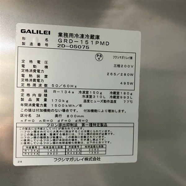 他の画像を見る 2022年製 フクシマガリレイ 縦型冷凍冷蔵庫 GRD-151PMD 大阪店 中古品 三相200V 定価 ¥ 1,831,500 のところ 販売価格 ¥ 165,000 税込 W1490xD800xH1950商品ランク:B カートに入れる お気に入りに登録する