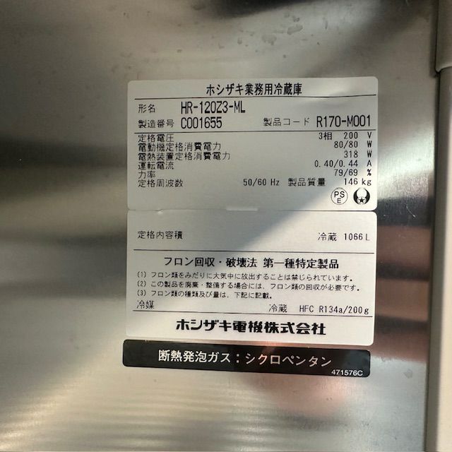 他の画像を見る 2014年製 ホシザキ 縦型冷凍冷蔵庫 HRF-120Z3 大阪店 中古品 三相200V 定価 ¥ 1,355,200 のところ 販売価格 ¥ 115,500 税込 W1200xD800xH1890商品ランク:B カートに入れる お気に入りに登録する