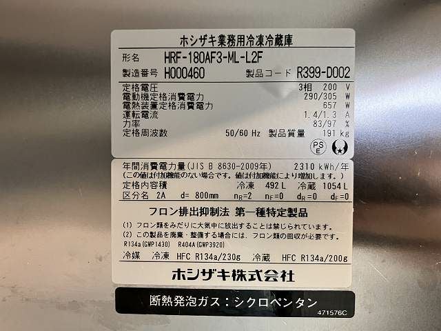 他の画像を見る 2018年製 ホシザキ 縦型冷凍冷蔵庫 HRF-180AF3-ML-L2F ※備考欄必読 愛知店 中古品 三相200V 販売価格 ¥ 181,500 税込 W1800xD800xH1910商品ランク:B カートに入れる お気に入りに登録する