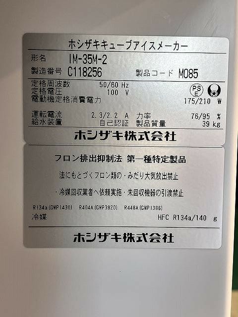 他の画像を見る 2024年製 ホシザキ 35kg製氷機 IM-35M-2 大阪店 中古品 単相100V 定価 ¥ 686,400 のところ 販売価格 ¥ 225,500 税込 W500xD450xH800商品ランク:B カートに入れる お気に入りに登録する