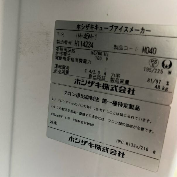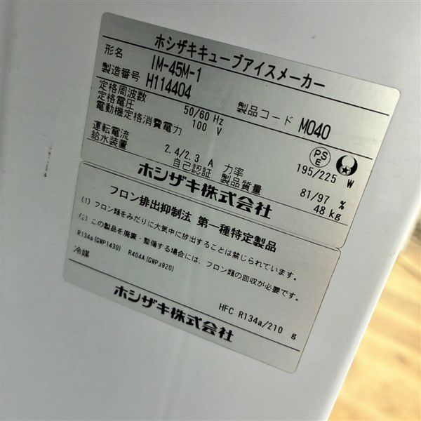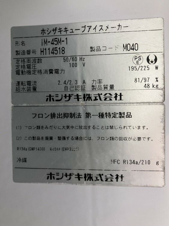 他の画像を見る 2018年製 ホシザキ 45kg製氷機 IM-45M-1 ※備考欄必読 愛知店 中古品 単相100V 定価 ¥ 760,100 のところ 販売価格 ¥ 162,800 税込 W630xD450xH800商品ランク:B カートに入れる お気に入りに登録する