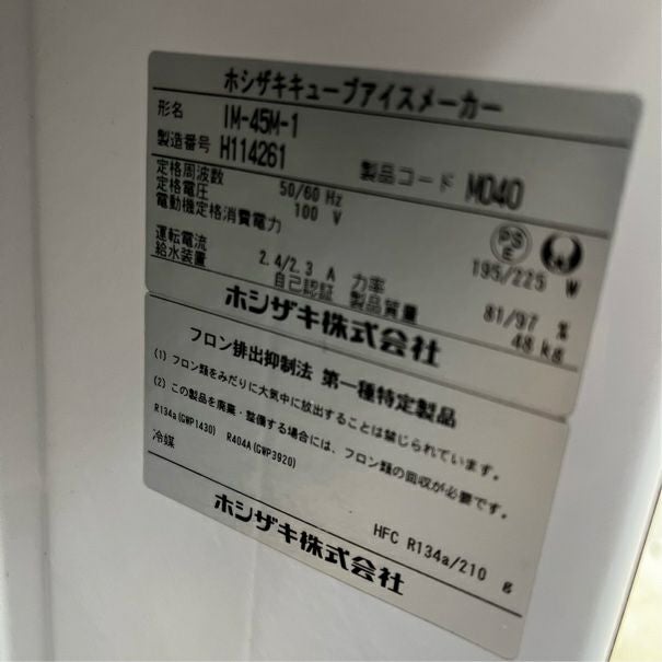 他の画像を見る 2019年製 ホシザキ 45kg製氷機 IM-45M-1 大阪店 中古品 単相100V 定価 ¥ 760,100 のところ 販売価格 ¥ 173,800 税込 W630xD450xH800商品ランク:B カートに入れる お気に入りに登録する