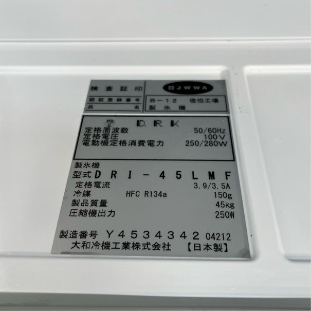 他の画像を見る 2024年製 大和冷機 45kg製氷機 DRI-45LMF 大阪店 中古品 単相100V 販売価格 ¥ 209,000 税込 SOLD OUT W630xD450xH800商品ランク:A 詳細を見る お気に入りに登録する