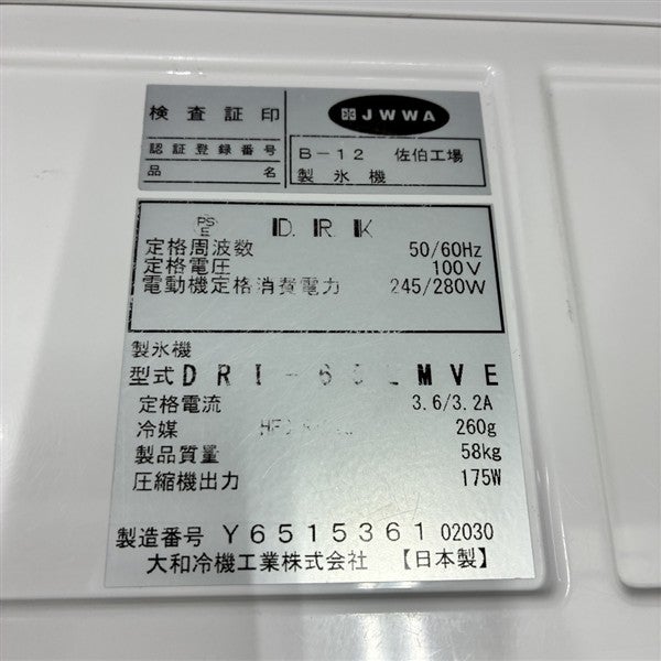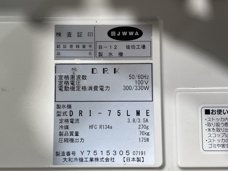 他の画像を見る 2021年製 大和冷機 75kg製氷機 DRI-75LME 東京町田店 中古品 単相100V 販売価格 ¥ 198,000 税込 SOLD OUT W700xD506xH1200商品ランク:B 詳細を見る お気に入りに登録する