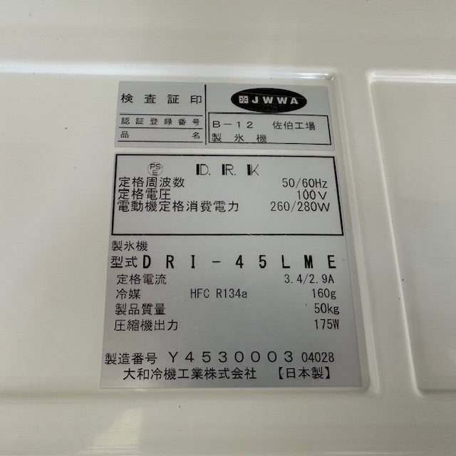 他の画像を見る 2018年製 大和冷機 45kg製氷機 DRI-45LME 東京足立店 中古品 単相100V 販売価格 ¥ 149,600 税込 SOLD OUT W630xD450xH800商品ランク:B 詳細を見る お気に入りに登録する
