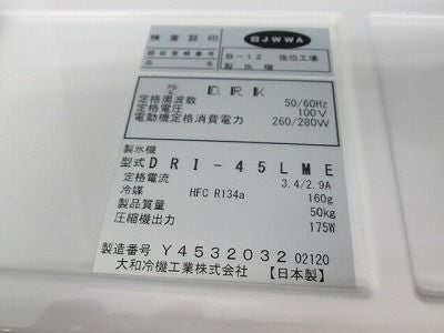他の画像を見る 2020年製 大和冷機 45kg製氷機 DRI-45LME 愛知店 中古品 単相100V 定価 ¥ 704,000 のところ 販売価格 ¥ 176,000 税込 SOLD OUT W630xD450xH800商品ランク:A 詳細を見る お気に入りに登録する