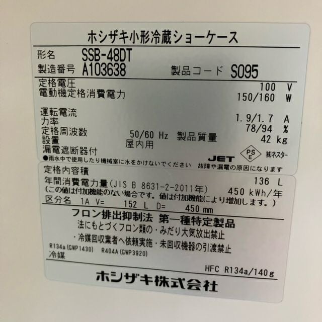 他の画像を見る 2021年製 ホシザキ 冷蔵ショーケース SSB-48DT 東京足立店 中古品 単相100V 定価 ¥ 217,800 のところ 販売価格 ¥ 67,100 税込 SOLD OUT W485xD450xH1410商品ランク:A 詳細を見る お気に入りに登録する