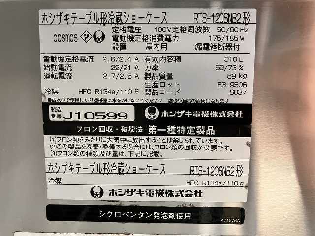 他の画像を見る 2009年製 ホシザキ テーブル形冷蔵ショーケース RTS-120SNB2 愛知店 中古品 単相100V 定価 ¥ 294,800 のところ 販売価格 ¥ 44,000 税込 SOLD OUT W1200xD600xH800商品ランク:C 詳細を見る お気に入りに登録する