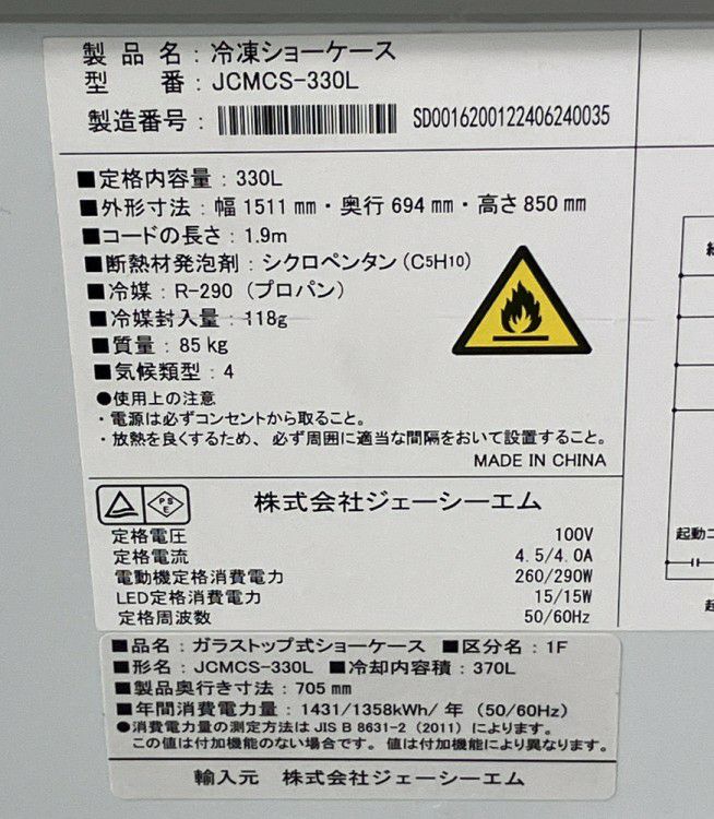 他の画像を見る 2024年製 JCM 冷凍ショーケース JCMCS-330L 東京町田店 中古品 単相100V 販売価格 ¥ 93,500 税込 W1511xD694xH850商品ランク:A カートに入れる お気に入りに登録する