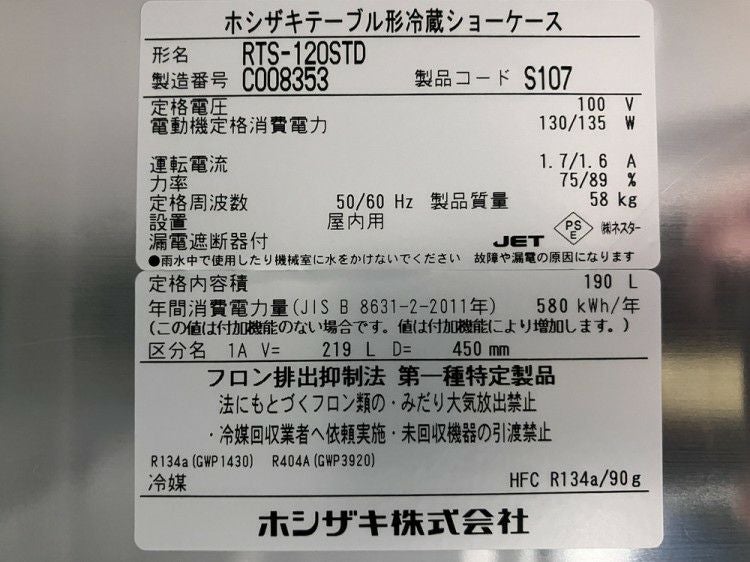 他の画像を見る 2011年製 ホシザキ テーブル形冷蔵ショーケース RTS-120STB2 東京足立店 中古品 単相100V 定価 ¥ 284,900 のところ 販売価格 ¥ 44,000 税込 SOLD OUT W1200xD450xH800商品ランク:B 詳細を見る お気に入りに登録する