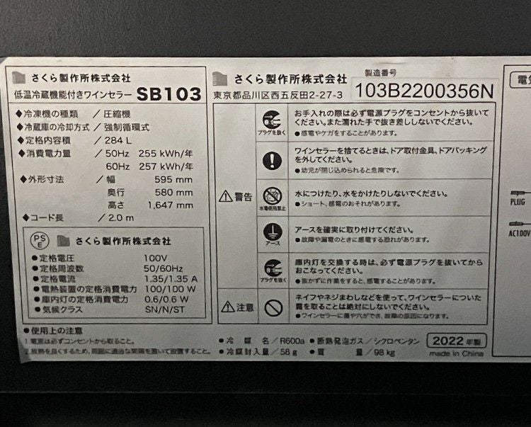 他の画像を見る 2022年製 さくら製作所 ワインセラー SB103 東京町田店 中古品 単相100V 販売価格 ¥ 121,000 税込 SOLD OUT W595xD580xH1647商品ランク:A 詳細を見る お気に入りに登録する