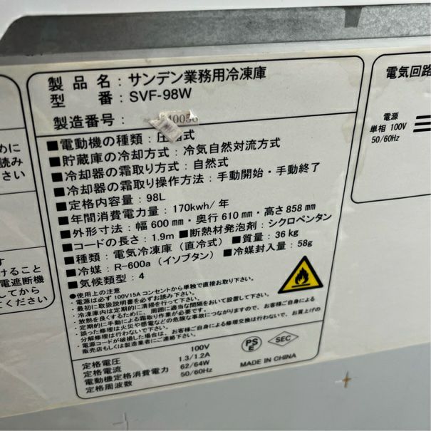 他の画像を見る 2019年製 サンデン 横型冷凍庫 SVF-98W 東京足立店 中古品 単相100V 定価 ¥ 146,300 のところ 販売価格 ¥ 17,600 税込 W600xD610xH858商品ランク:B カートに入れる お気に入りに登録する