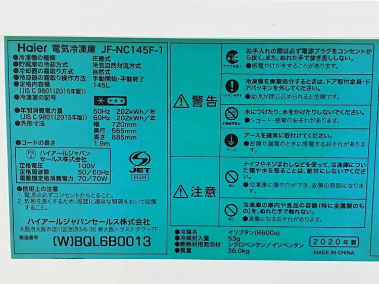 他の画像を見る 2020年製 ハイアール 冷凍ストッカー JF-NC-145F-1 東京町田店 中古品 単相100V 販売価格 ¥ 19,800 税込 SOLD OUT W720xD565xH885商品ランク:B 詳細を見る お気に入りに登録する