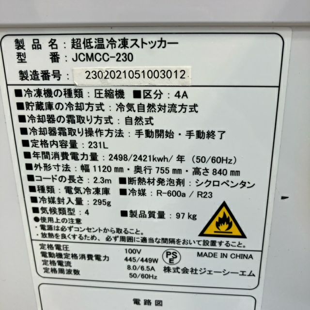 他の画像を見る 2021年製 JCM 超低温冷凍ストッカー JCMCC-230 東京足立店 中古品 単相100V 販売価格 ¥ 99,000 税込 SOLD OUT W1120xD755xH840商品ランク:B 詳細を見る お気に入りに登録する