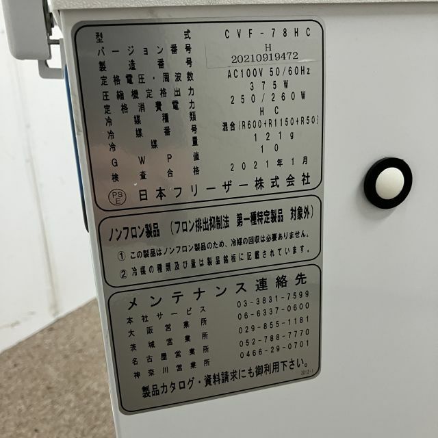 他の画像を見る 2021年製 日本フリーザー 冷凍ストッカー CVF-78HC 大阪店 中古品 単相100V 販売価格 ¥ 209,000 税込 SOLD OUT W557xD557+88xH887商品ランク:A 詳細を見る お気に入りに登録する