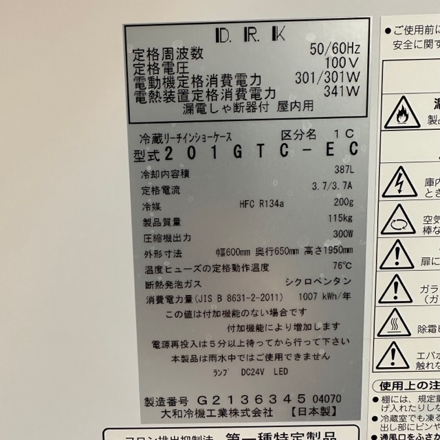 2020年製 大和冷機 リーチイン冷蔵ショーケース 201GTC-EC