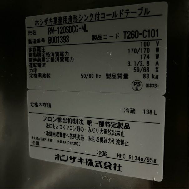 他の画像を見る 2022年製 ホシザキ 舟形シンク付冷蔵コールドテーブル RW-120SDCG-ML 東京足立店 中古品 単相100V 定価 ¥ 1,108,800 のところ 販売価格 ¥ 149,600 税込 W1200xD750xH800商品ランク:A カートに入れる お気に入りに登録する