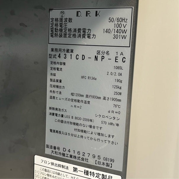 他の画像を見る 2019年製 大和冷機 縦型冷蔵庫 431CD-NP-EC 東京足立店 中古品 単相100V 販売価格 ¥ 110,000 税込 W1200xD800xH1905商品ランク:B カートに入れる お気に入りに登録する