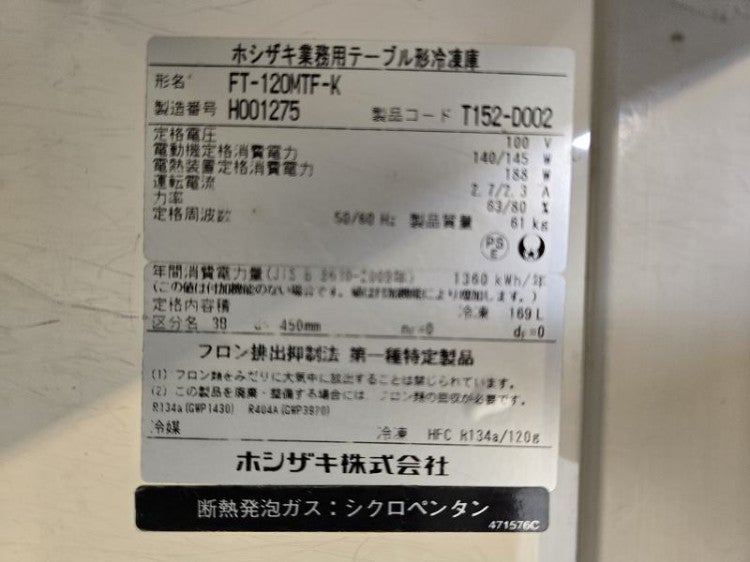 他の画像を見る 2018年製 ホシザキ 冷凍コールドテーブル FT-120MTF-F ※備考欄必読 愛知店 中古品 単相100V 販売価格 ¥ 99,000 税込 W1200xD450xH800商品ランク:B カートに入れる お気に入りに登録する