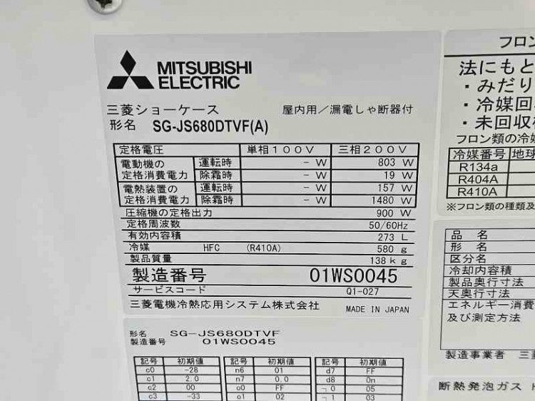 他の画像を見る 2020年製 三菱電機株式会社 平型オープン冷凍ショーケース SG-JS680DTVF(A) 愛知店 中古品 三相200V 定価 ¥ 1,428,900 のところ 販売価格 ¥ 231,000 税込 W1800xD900xH900商品ランク:B カートに入れる お気に入りに登録する