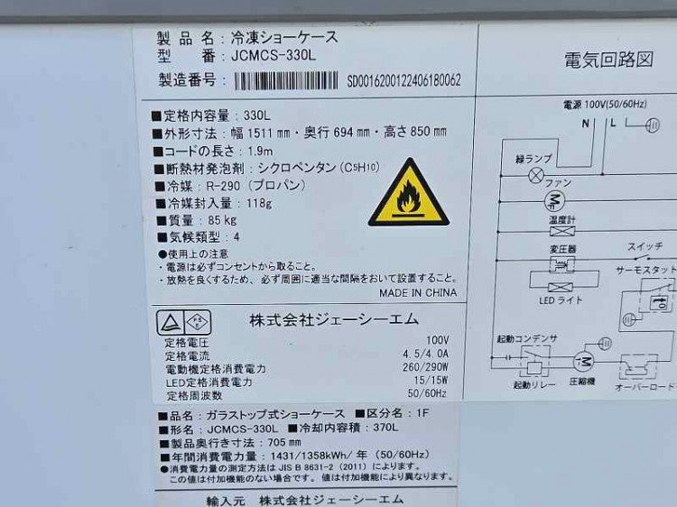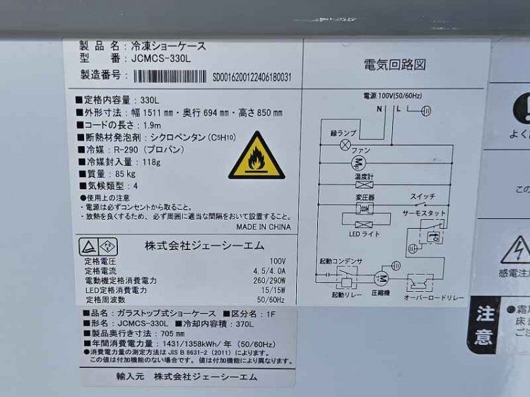 他の画像を見る 2024年製 JCM 冷凍ショーケース JCMCS-330L 愛知店 中古品 単相100V 販売価格 ¥ 88,000 税込 W1511xD694xH850商品ランク:B カートに入れる お気に入りに登録する