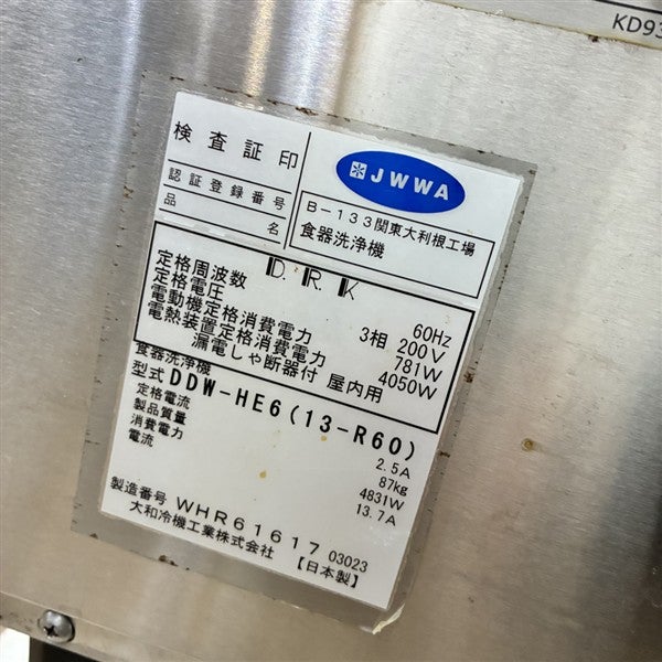 他の画像を見る 2023年製 大和冷機 食器洗浄機・右ドアタイプ DDW-HE6(13-R60)※60Hz(西日本)専用 大阪店 中古品 三相200V 販売価格 ¥ 287,100 税込 W600xD600xH1290商品ランク:B カートに入れる お気に入りに登録する