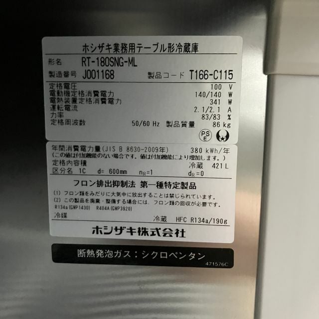 他の画像を見る 2019年製 ホシザキ 冷蔵コールドテーブル RT-180SNG-ML 大阪店 中古品 単相100V 定価 ¥ 1,068,100 のところ 販売価格 ¥ 154,000 税込 SOLD OUT W1800xD600xH800商品ランク:B 詳細を見る お気に入りに登録する