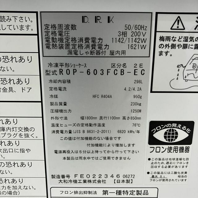 他の画像を見る 2022年製 大和冷機 平型オープン冷蔵ショーケース ROP-603FCB-EC 大阪店 中古品 三相200V 定価 ¥ 1,533,400 のところ 販売価格 ¥ 297,000 税込 SOLD OUT W1800xD1100xH850商品ランク:B 詳細を見る お気に入りに登録する