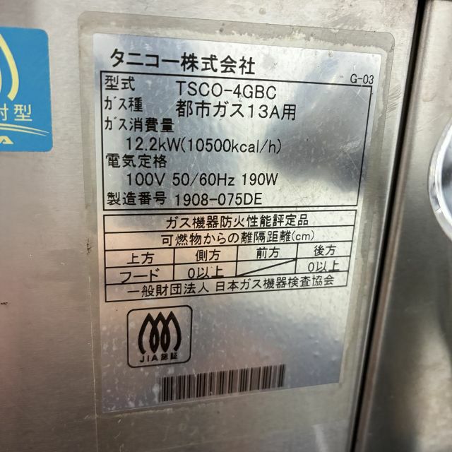 他の画像を見る 2019年製 タニコー ガス式スチームコンベクションオーブン TSCO-4GBC 大阪店 中古品 単相100V 都市ガス 定価 ¥ 1,210,000 のところ 販売価格 ¥ 236,500 税込 SOLD OUT W750xD600xH560商品ランク:B 詳細を見る お気に入りに登録する