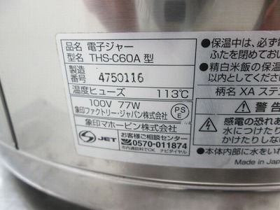 他の画像を見る 2015年製 象印 電子保温ジャー THS-C60A 愛知店 中古品 単相100V 販売価格 ¥ 9,350 税込 SOLD OUT W460xD380xH320商品ランク:B 詳細を見る お気に入りに登録する
