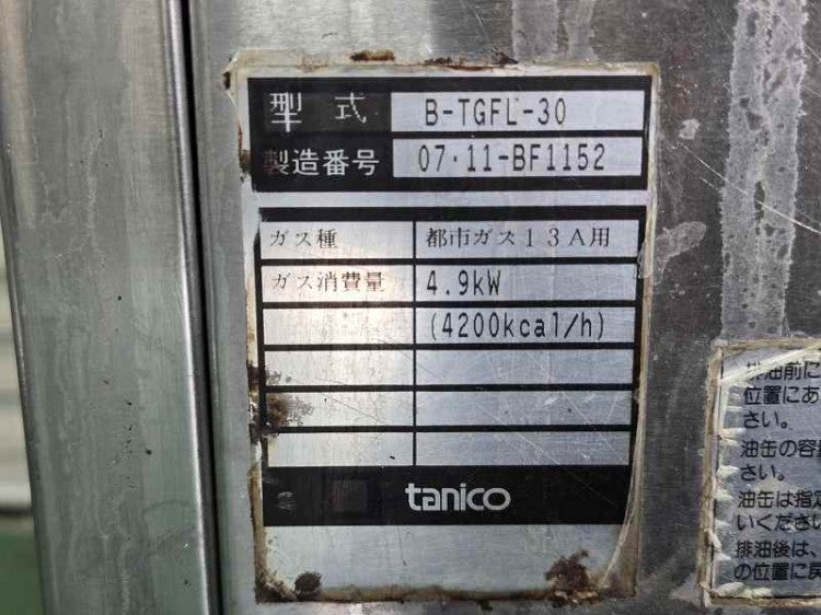 他の画像を見る 2007年製 タニコー ガスフライヤー B-TGFL-30 愛知店 中古品 都市ガス 販売価格 ¥ 38,500 税込 W300xD600xH800+270商品ランク:B カートに入れる お気に入りに登録する