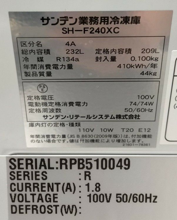 2016年製 サンデン 冷凍ストッカー SH-F240XC