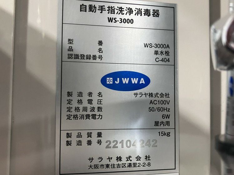 他の画像を見る 2022年製 サラヤ 自動手指洗浄消毒器(手洗い器) WS-3000A 東京町田店 中古品 単相100V 販売価格 ¥ 28,600 税込 W570xD440xH618商品ランク:B カートに入れる お気に入りに登録する