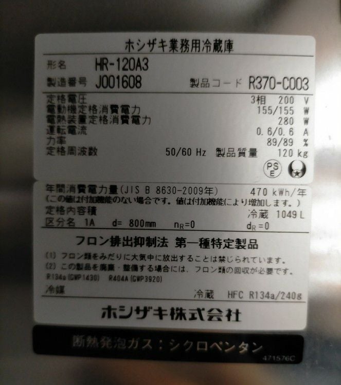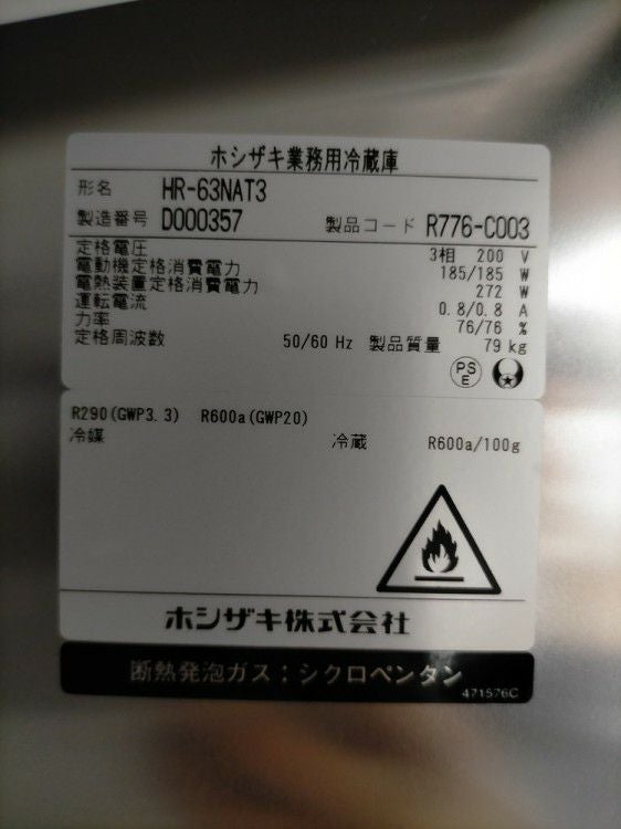 他の画像を見る 2024年製 ホシザキ 縦型冷蔵庫 HR-63NAT3 東京町田店 中古品 三相200V 販売価格 ¥ 187,000 税込 W625xD650xH1910商品ランク:B カートに入れる お気に入りに登録する